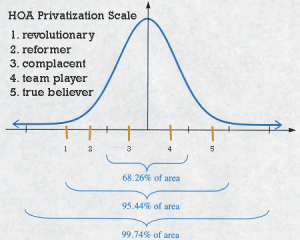 Note:  As you read this commentary, please keep in mind the serious revelations of wrong-doing in HOA-Land: in Nevada, in California with corrupt judges, in Arizona where the case files on charges against an HOA attorney for aiding and abetting have been sealed, and in those states with consumer “pacifier” ombudsmen who accomplish very little.   Many will blame the government, and ignore the role played by the HOA member in allowing such activities to happen with such ease.  The Privatization Scale shows an attitude that can be described as an irrational fear of, “Don’t make waves otherwise the government will take my HOA away.”